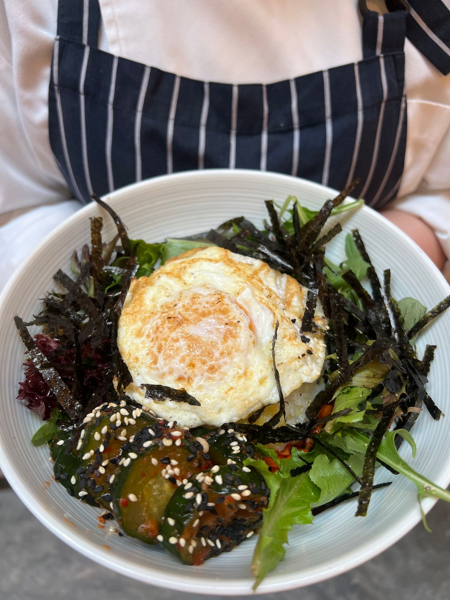 White radish, red, green, yellow capsicum, fresh shiitake, carrot cooked in garlic olive oil, sesame oil, fresh greens, house made cucumber kimchi, Aussie fried egg, Korean roasted seaweed and Bibimbap sauce made with our house made Gochujang and TIANN’S maple syrup with organic millet rice.