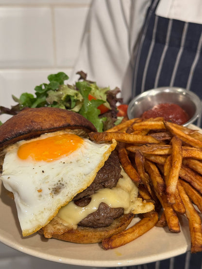 TIANN’S WAGYU BURGER Grass-fed New Zealand Wagyu beef patties, Emmental cheese, Aussie fried egg, caramelised onions, house "HP" sauce, cushioned in our house sourdough burger bun, w house pesto fresh greens, duck fat fries, house made Italian ketchup and house mayonnaise*.