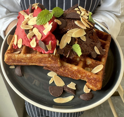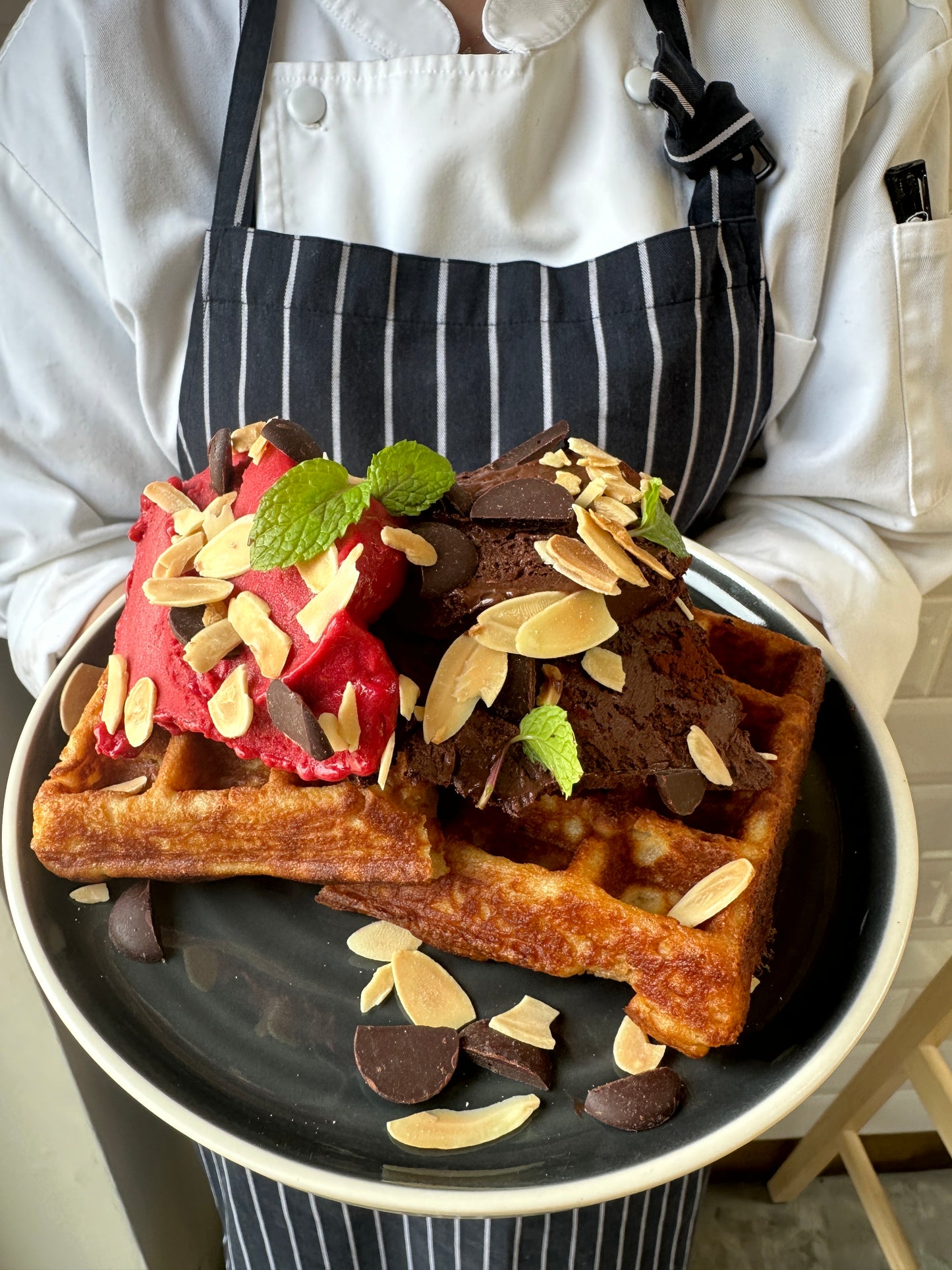 Our brown rice sweet waffles, with two of your favourite churned gelato, Valrhona dark chocolate chips, Aussie almonds, home-grown mint.