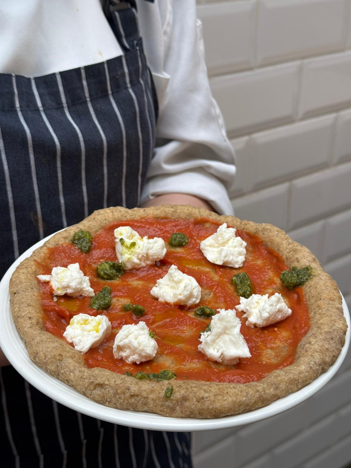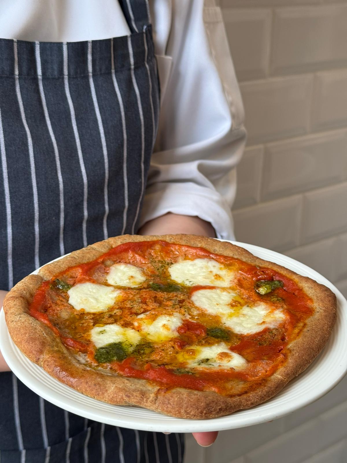 Served Frozen. Good for one. Made with house made tomato base, house made pesto, mozzarella.