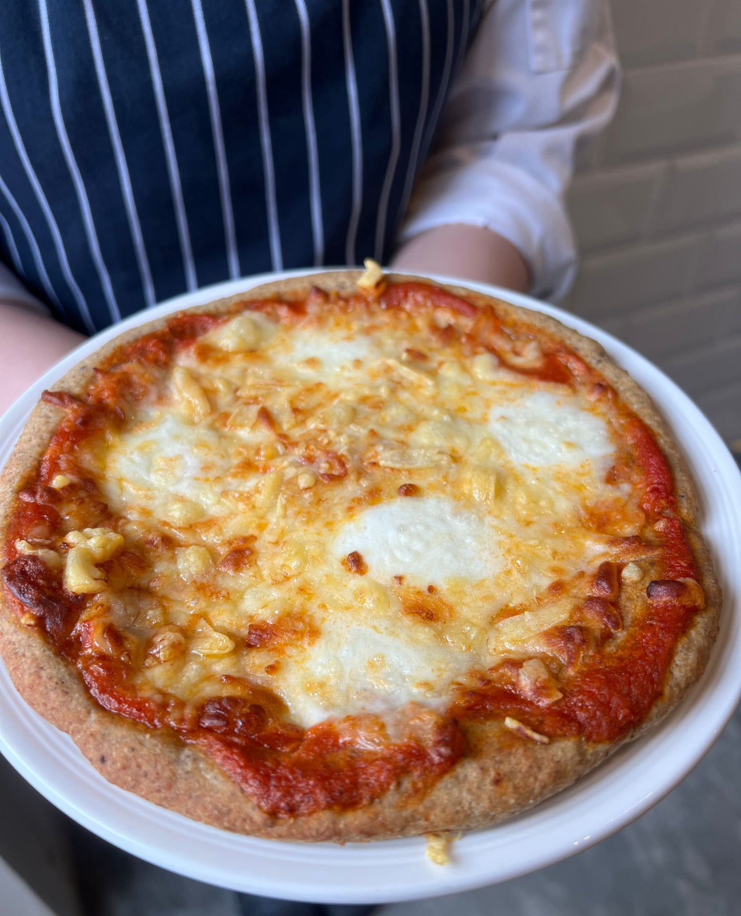 Served Frozen. Good for one. Made with house made tomato base, mozzarella, emmental.